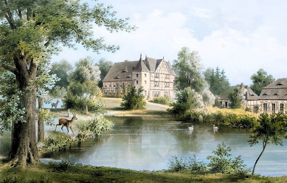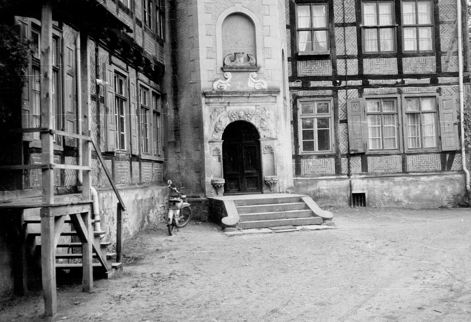 Das Herrenhaus in den 1960er Jahren. Links eine angebaute Treppe zu einer der Wohnungen, die sich damals im Haus befanden.